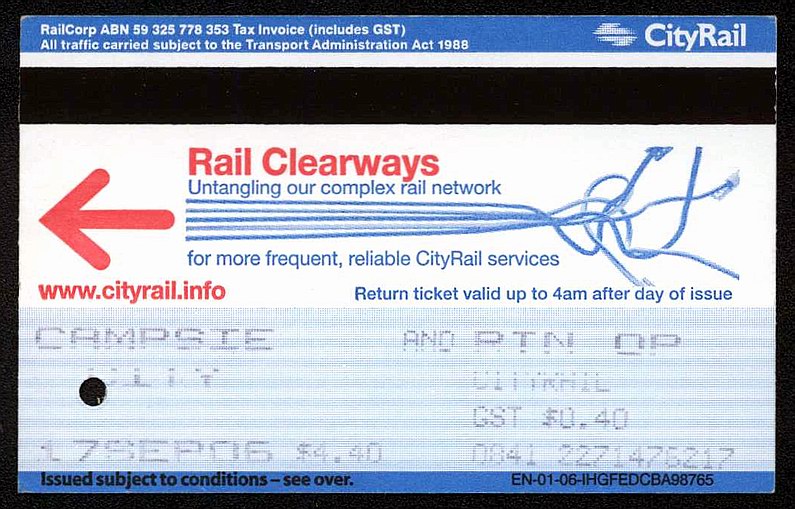 The 01-05 series was in use by by July 2005. There were 11 www.cityrail.info ads on the rear: AN-01-05, BN-01-05, CN-01-05, DN-01-05, EN-01-05, FN-01-05. The 02-05 series was in use by by December 2005. There were 11 www.cityrail.info ads on the rear: AN-02-05, BN-02-05, CN-02-05, DN-02-05, EN-02-05, FN-02-05. The 03-05 series was in use by by January 2006. There were 11 www.cityrail.info ads on the rear: AN-03-05, BN-03-05, CN-03-05, DN-03-05, EN-03-05, FN-03-05. The 04-05 series was in use by by April 2006. There were 10 www.cityrail.info ads on the rear: AN-04-05, BN-04-05, CN-04-05, DN-04-05, EN-04-05, FN-04-05. Commencing with the 01-06 series, "Issued subject to conditions - see over" was printed along the bottom left hand edge.