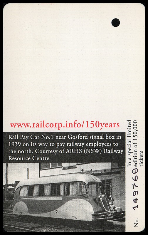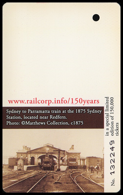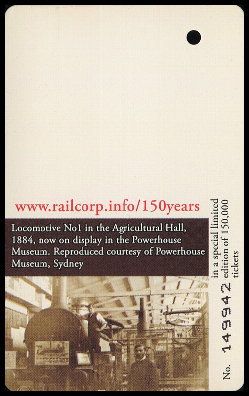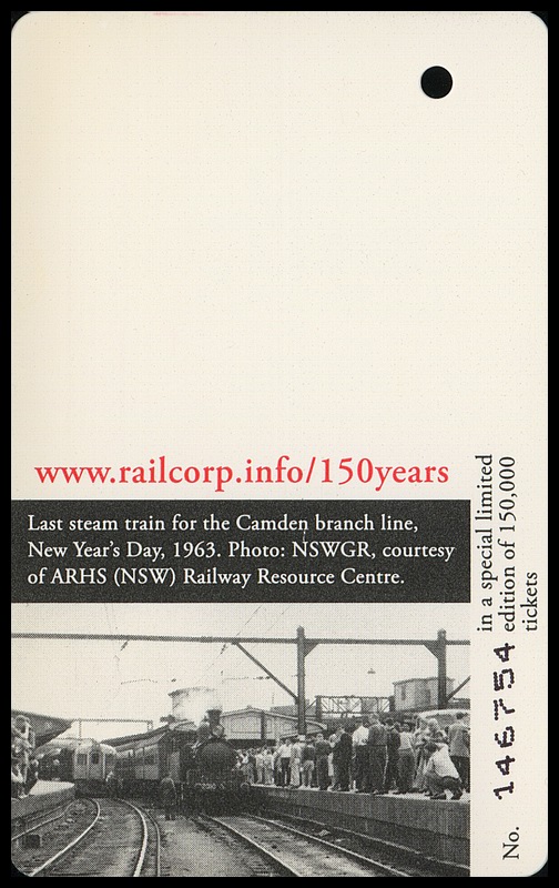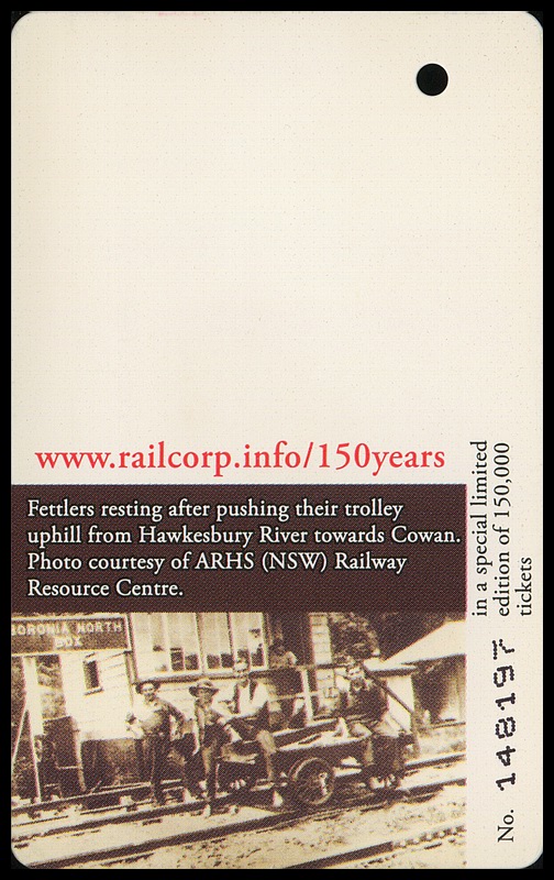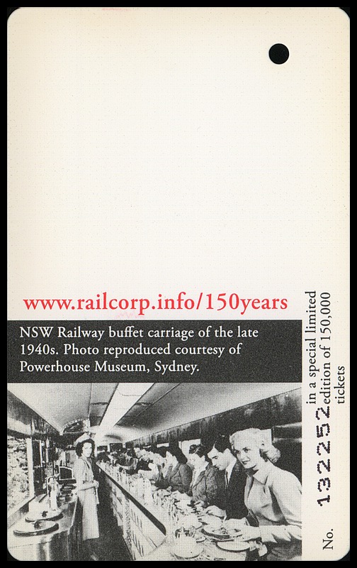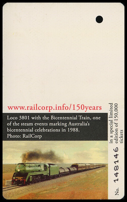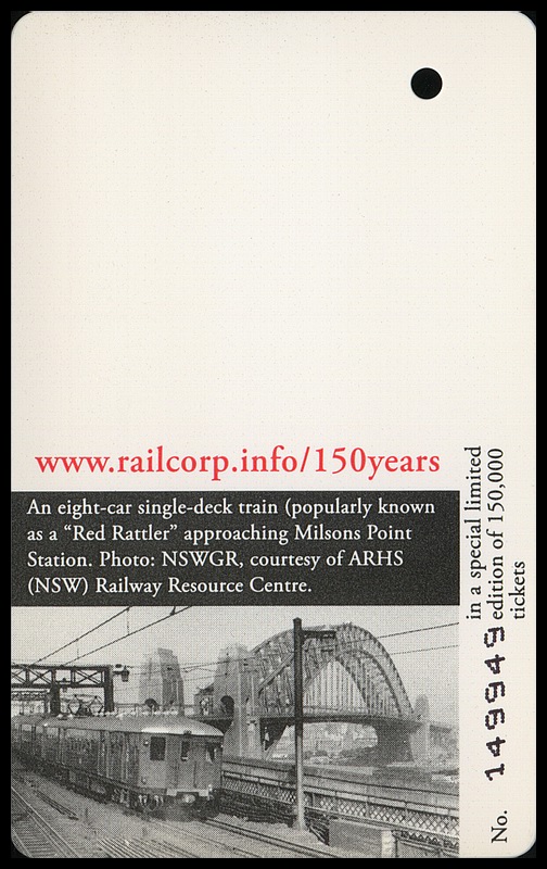 "CityRail has produced a special limited edition of 150,000 periodical tickets, featuring 24 different designs depicting historical moments in NSW railways. Customers buying CityRail tickets valid for 28 days or more will be issued one of these memorable designs. Each ticket features an individual number from 1 to 150,000." 5000 sets of 24 = 120,000 1875 sets of 16 = 30,000 total 150,000