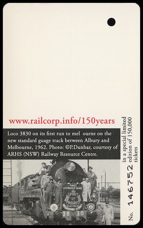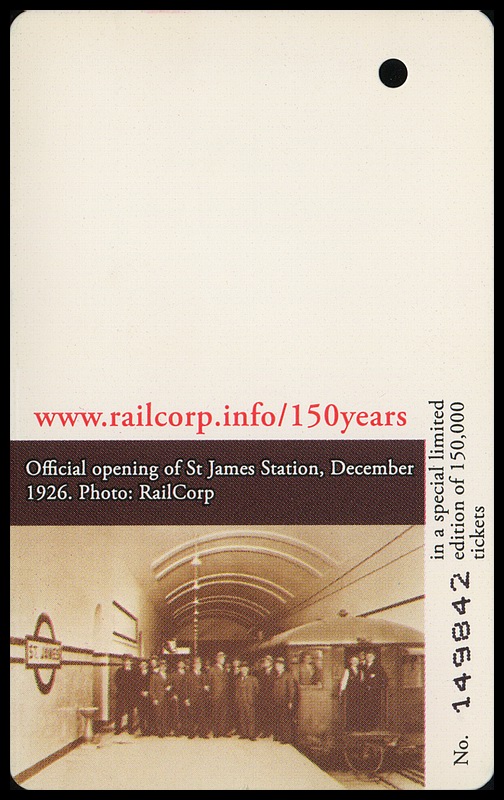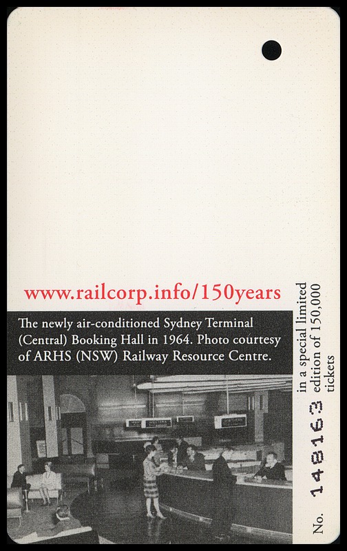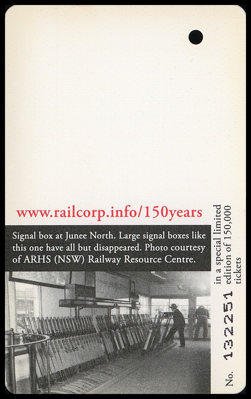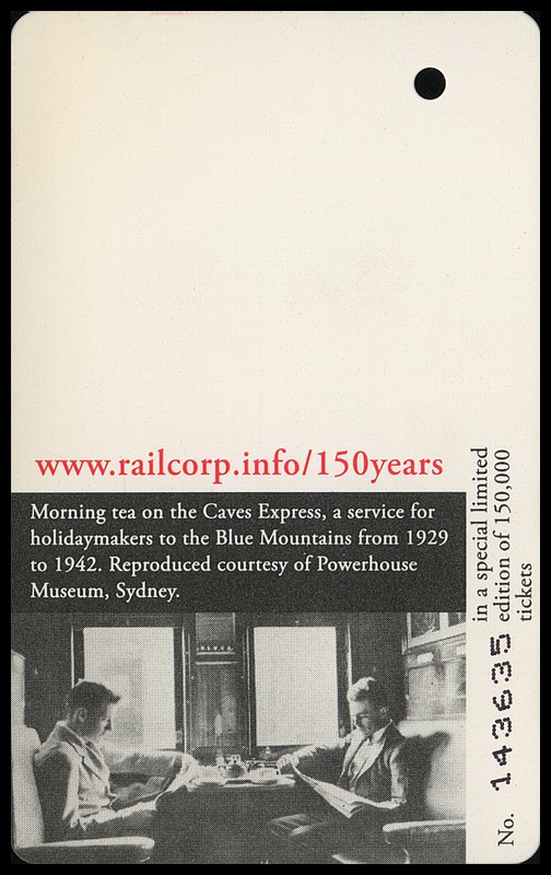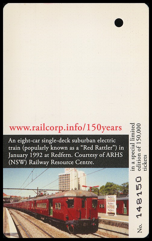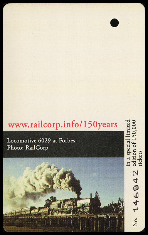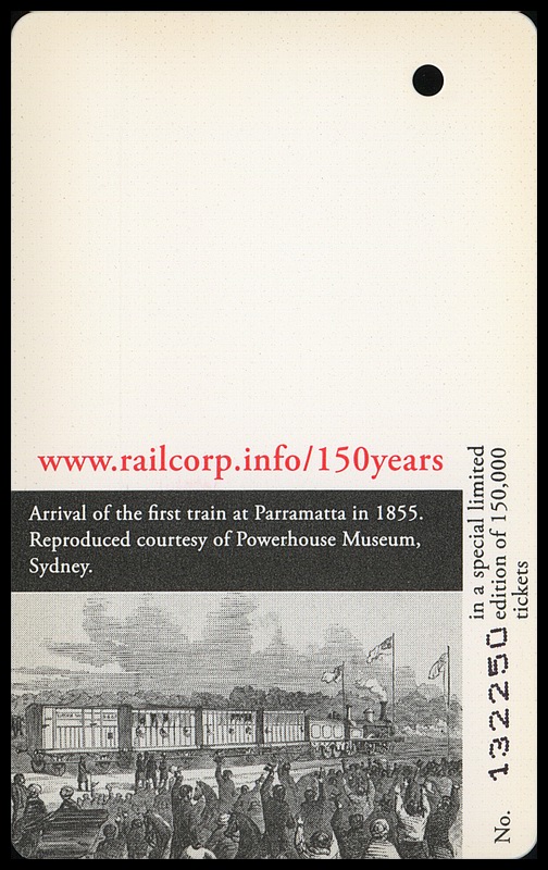 "CityRail has produced a special limited edition of 150,000 periodical tickets, featuring 24 different designs depicting historical moments in NSW railways. Customers buying CityRail tickets valid for 28 days or more will be issued one of these memorable designs. Each ticket features an individual number from 1 to 150,000." 5000 sets of 24 = 120,000 1875 sets of 16 = 30,000 total 150,000